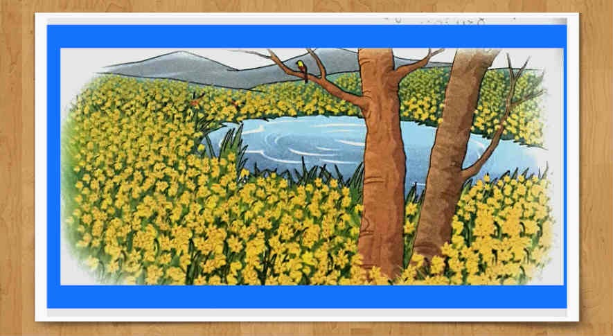 Answer c: The daffodils flowers were by the side of the lake under the trees. They were fluttering under in the breeze as if they were dancing like humans bein expressing their joy and energy.