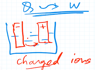 In an ionized electrolyte charged ions flow from one plate to another. For example, negative ions flow from the cathode to the anode and positive ions flow from the anode to the cathode.